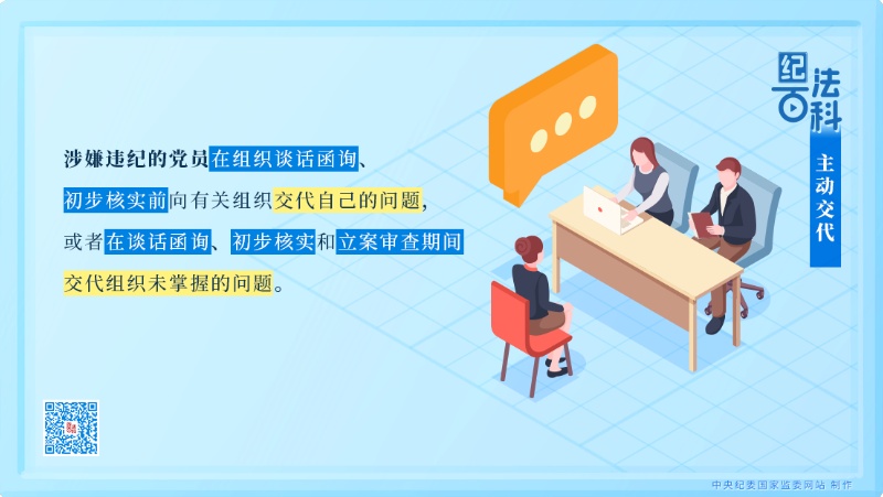 《中國共產黨紀律處分條例》第四十條規定:“本條例所稱主動交代,是指涉嫌違紀的黨員在組織談話函詢、初步核實前向有關組織交代自己的問題,或者在談話函詢、初步核實和立案審查期間交代組織未掌握的問題。”